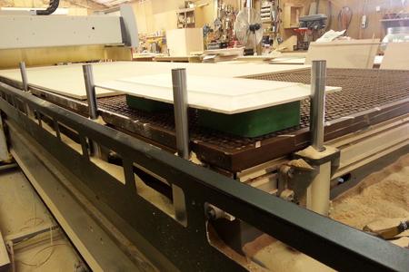 Parts do not have to cover the entire machine. Here is a panel being processed in the upper left cover. The rest of the bed has been covered in a sheet of platstic. Why? The machine uses a vacuum pump to hold down the parts to be processed. The plastic covers the unused portion of the bed to concentrate the vacuum to the part being processed.